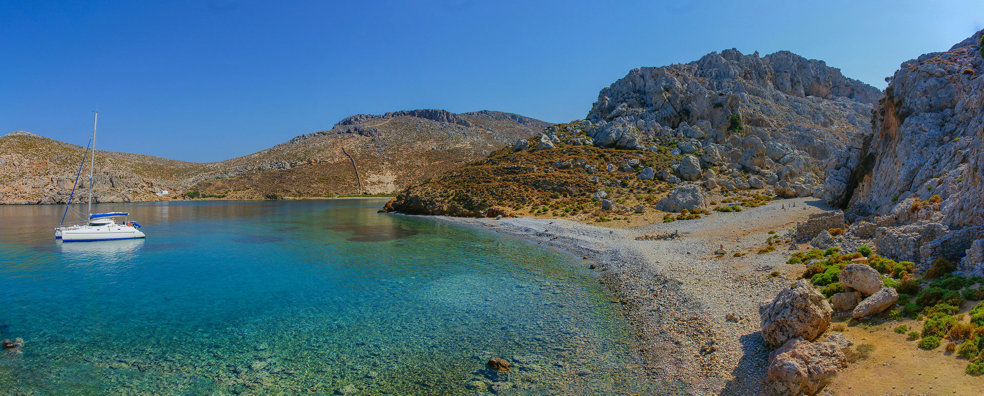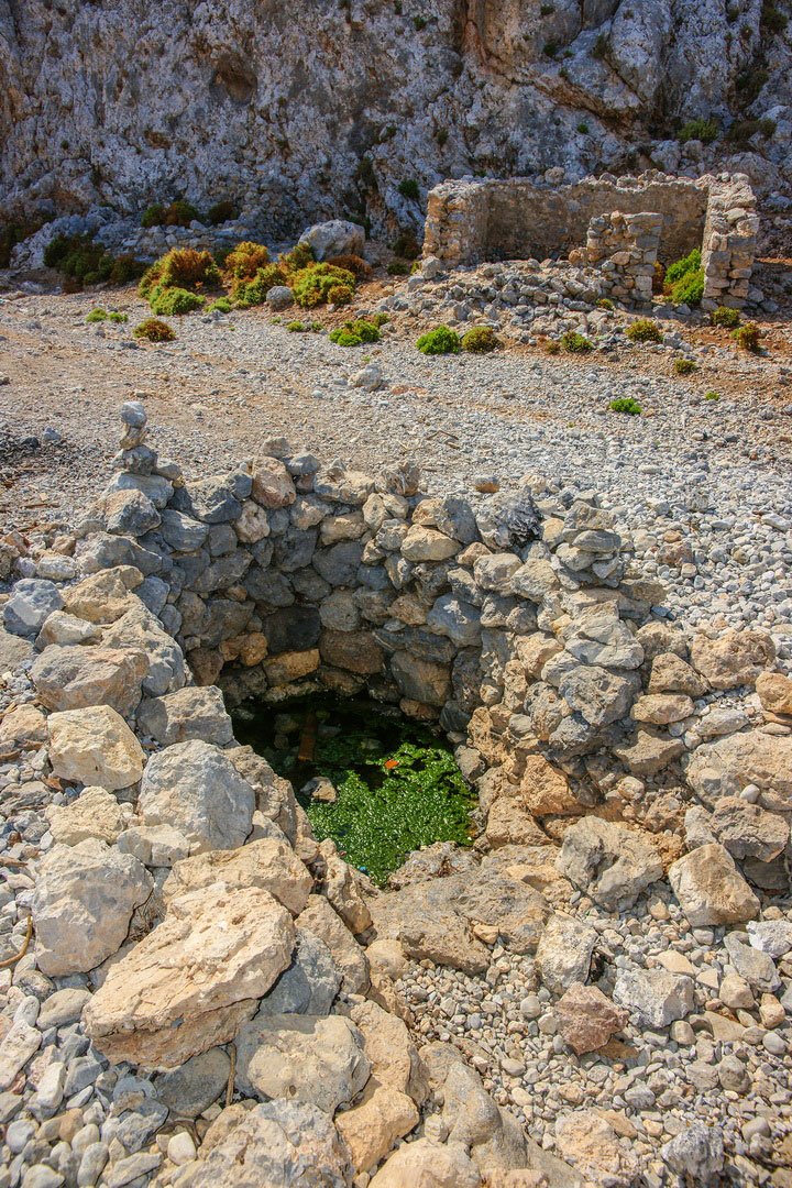 Το πρώτο σημείο βρίσκεται στο βόρειο τμήμα της μεγάλης παραλίας, σε απόσταση 75 μέτρων νότια του ναϋδρίου του Αγίου Γεωργίου. Πρόκειται για τα απομεινάρια κτιστής κατασκευής ορθογώνιας κάτοψης, η οποία εσωτερικά χωρίζεται σε τέσσερα διαμερίσματα. Η πλευρά που βλέπει προς τη θάλασσα έχει καταστραφεί από τα κύματα. Τόσο στη στεριά όσο και στο βυθό της θάλασσας, υπάρχουν πολυπληθή θραύσματα από άβαφα πρωτοβυζαντινά / παλαιοχριστιανικά αγγεία.